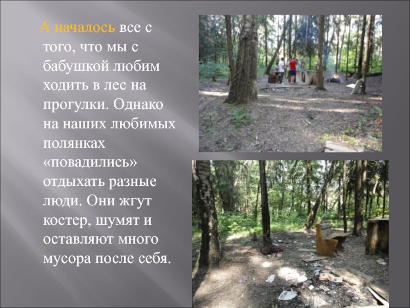 в лес на прогулки. Однако на наших любимых полянках «повадились» отдыхать разные люди. Они жгут костер, шумят и оставляют много мусора после себя.
