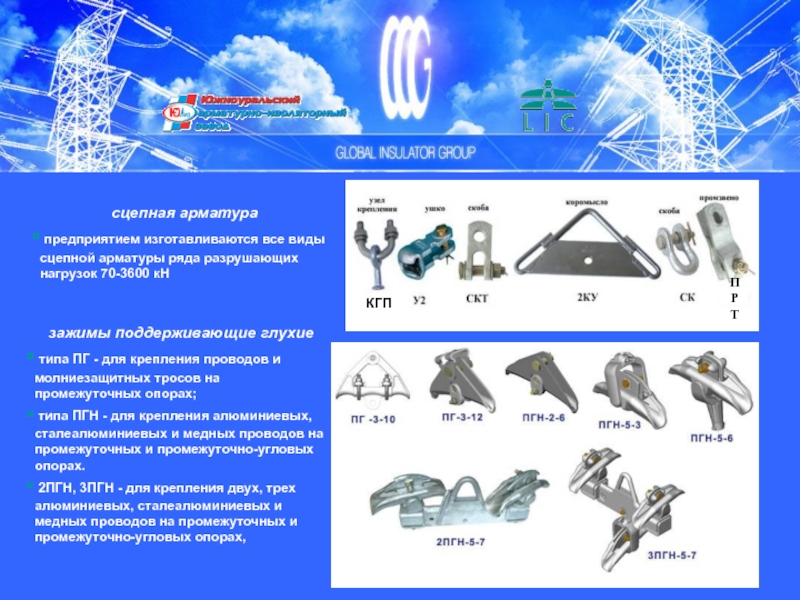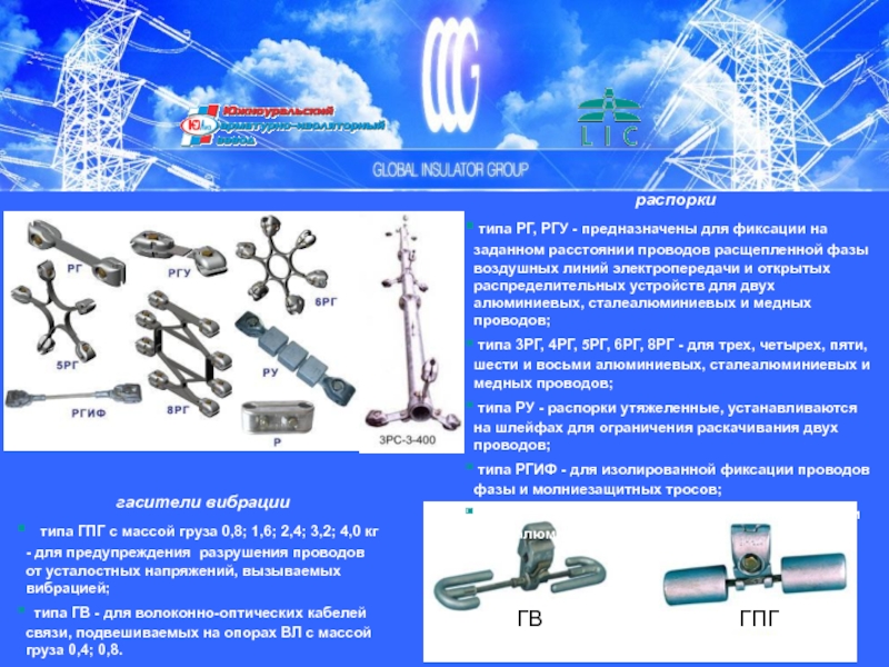 175 видов защитной арматуры: гасители вибрации, распорки, рога разрядные, экран ошиновки, зажимы болтовые типа ПАБ, балласты узел крепления экранов УКЭ-1Б.