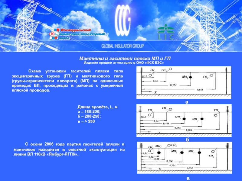 Схема установки гасителей пляски типа эксцентричных грузов (ГП) и маятникового типа (грузы-ограничители поворота) (МП) на одиночных проводах ВЛ, проходящих в районах с умеренной пляской проводов.
