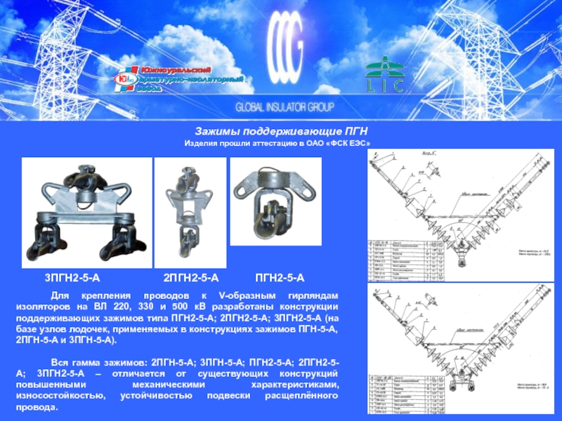 Для крепления проводов к V-образным гирляндам изоляторов на ВЛ 220, 330 и 500 кВ разработаны конструкции поддерживающих зажимов типа ПГН2-5-А; 2ПГН2-5-А; 3ПГН2-5-А (на базе узлов лодочек, применяемых в конструкциях зажимов ПГН-5-А, 2ПГН-5-А и 3ПГН-5-А).