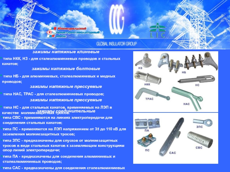 натяжная арматура: зажимы натяжные болтовые, зажимы натяжные клиновые, зажимы натяжные прессуемые;