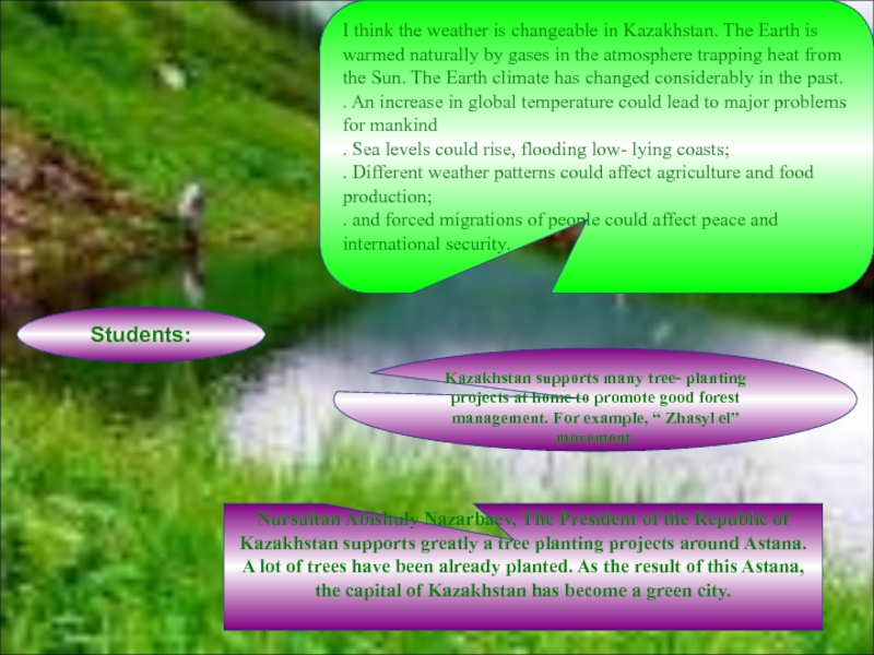 Kazakhstan supports many tree- planting projects at home to promote good forest management. For example, “ Zhasyl el” movement.