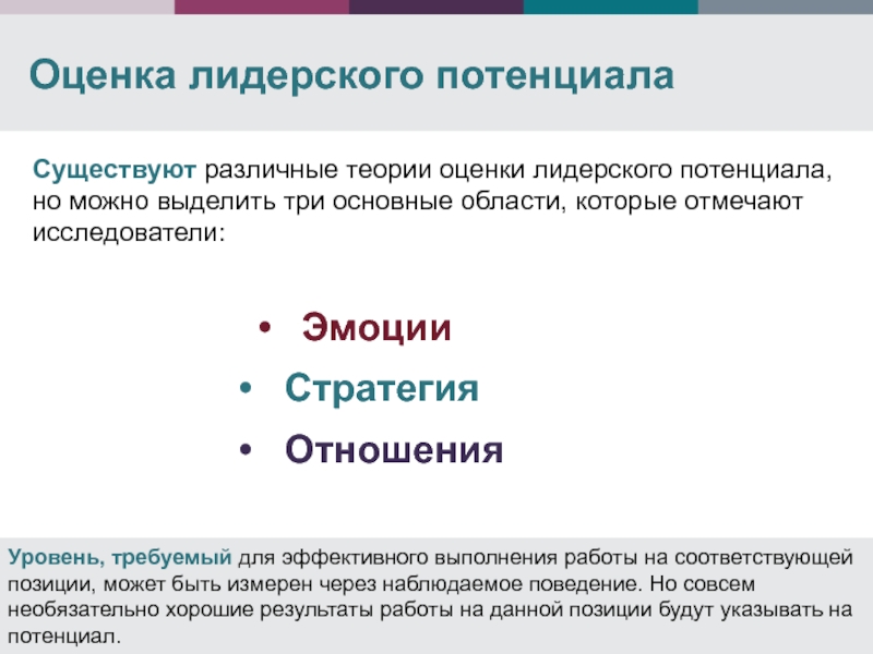 Существуют различные теории оценки лидерского потенциала, но можно выделить три основные области, которые отмечают исследователи: