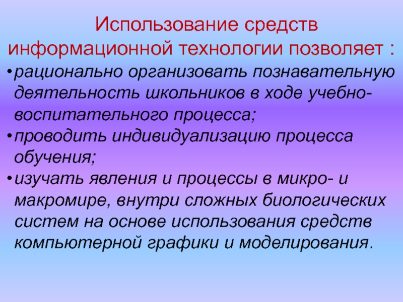 изучать явления и процессы в микро- и макромире, внутри сложных биологических систем на основе использования средств компьютерной графики и моделирования.
