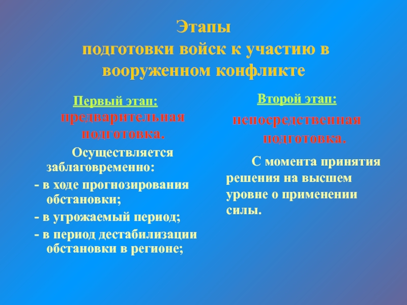 - локализация очага напряженности, создание предпосылок для прекращения войны, вооруженного конфликта либо для принуждения к их прекращению на ранних стадиях;