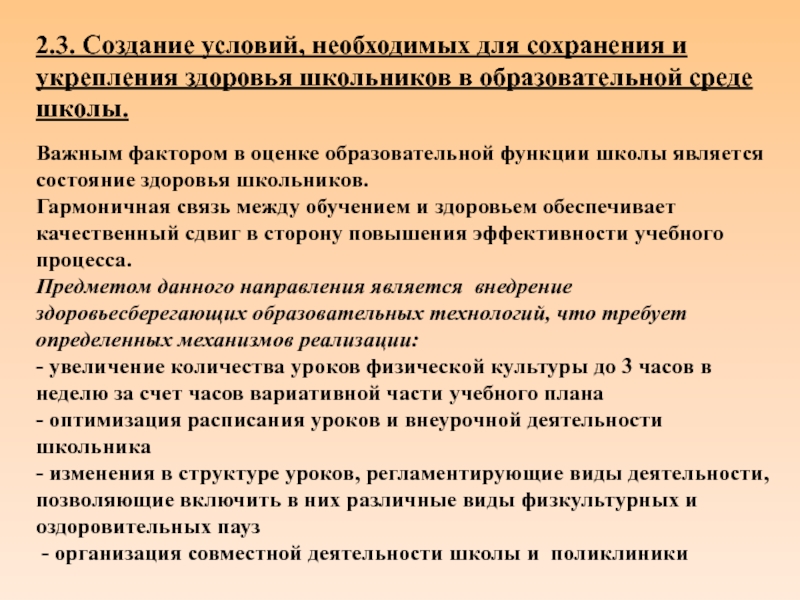 2.3. Создание условий, необходимых для сохранения и укрепления здоровья школьников в образовательной среде школы