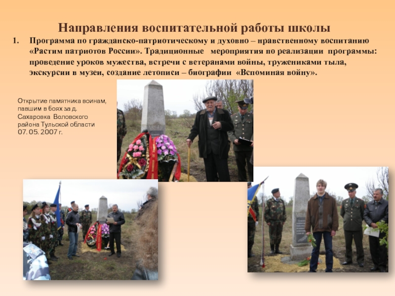 Программа по гражданско-патриотическому и духовно – нравственному воспитанию «Растим патриотов России». Традиционные мероприятия по реализации программы: проведение уроков мужества, встречи с ветеранами войны, тружениками тыла, экскурсии в музеи, создание летописи – биографии «Вспоминая войну».