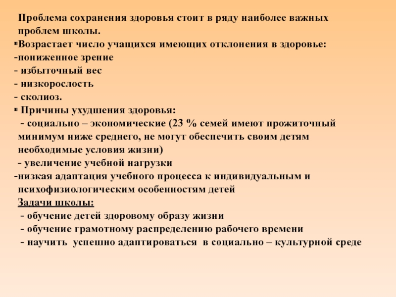 Важным фактором в оценке образовательной функции школы является состояние здоровья школьников.