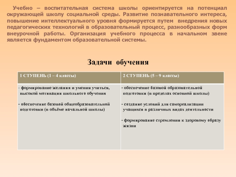 Слайд 7Учебно – воспитательная система школы ориентируется на потенциал окружающей школу социальной