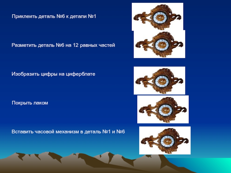 Вставить часовой механизм в деталь №1 и №6