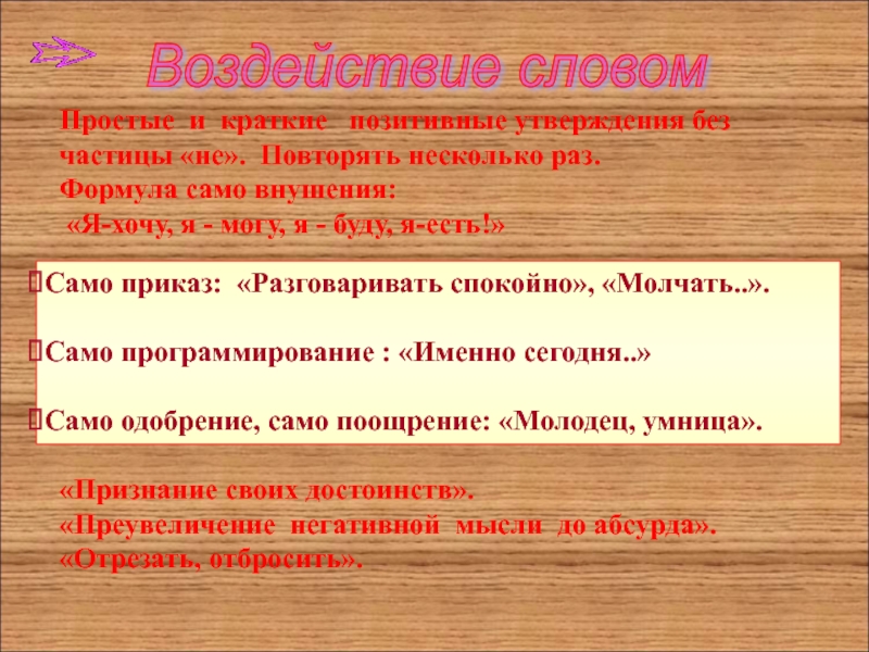 Простые и краткие позитивные утверждения без частицы «не». Повторять несколько раз.