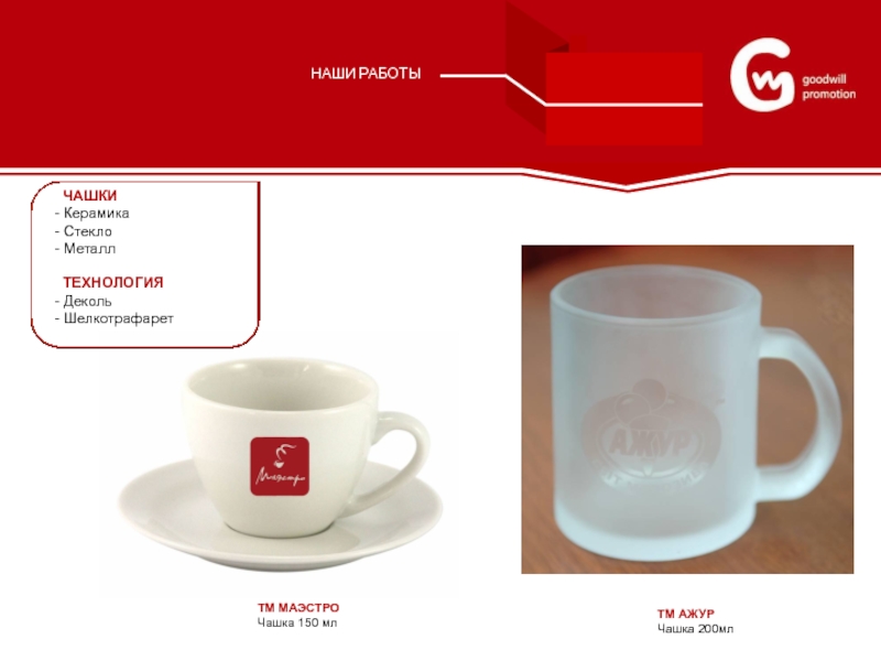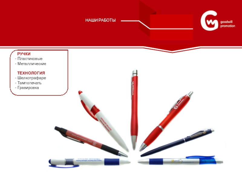 Для нанесения фирменной символики мы используем такие технологии, как тампопечать, гравировка, тиснение, конгрев, офсет, шелкография, вышивка.