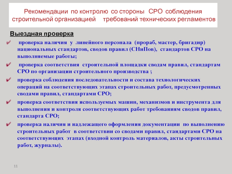 проверка соответствия строительной площадки стандартам СРО по организации строительного производства ;