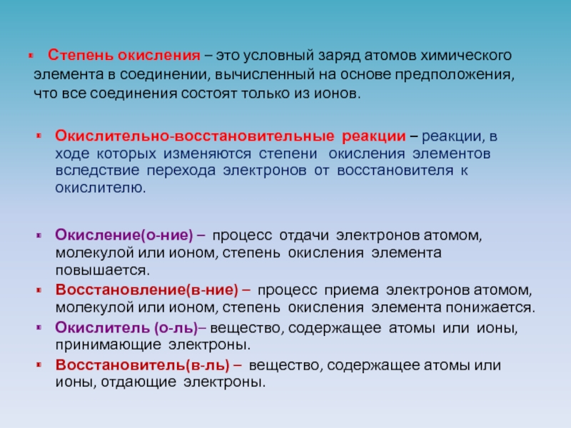 Окисление(о-ние) – процесс отдачи электронов атомом, молекулой или ионом, степень окисления элемента повышается.