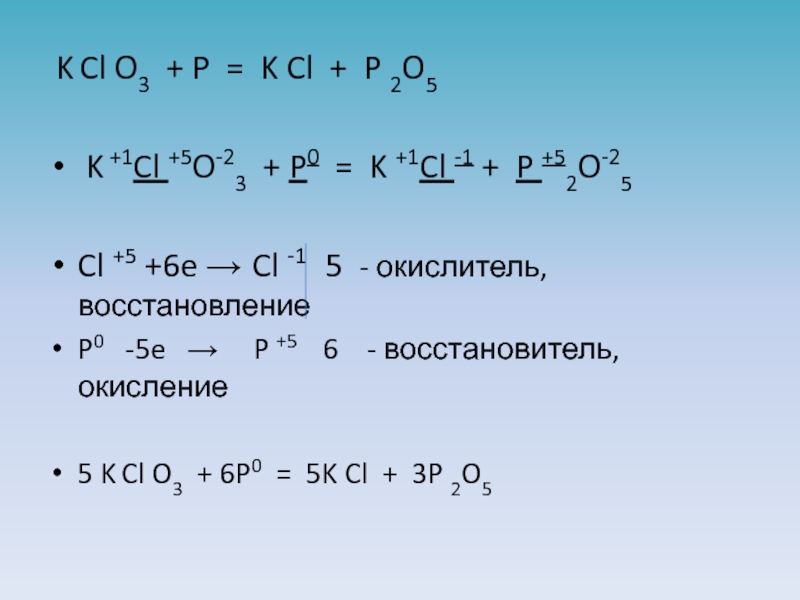 K +1Cl +5O-23 + P0 = K +1Cl -1 + P +52O-25