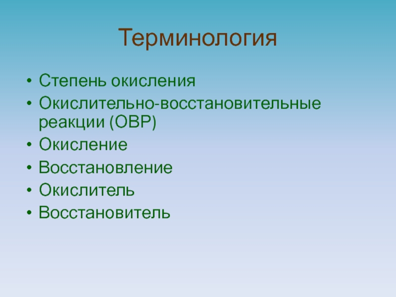 Окислитель (о-ль)– вещество, содержащее атомы или ионы, принимающие электроны.