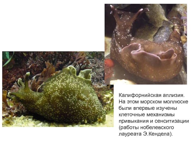 Слайд 9Калифорнийская аплизия. На этом морском моллюске были впервые изучены клеточные механизмы
