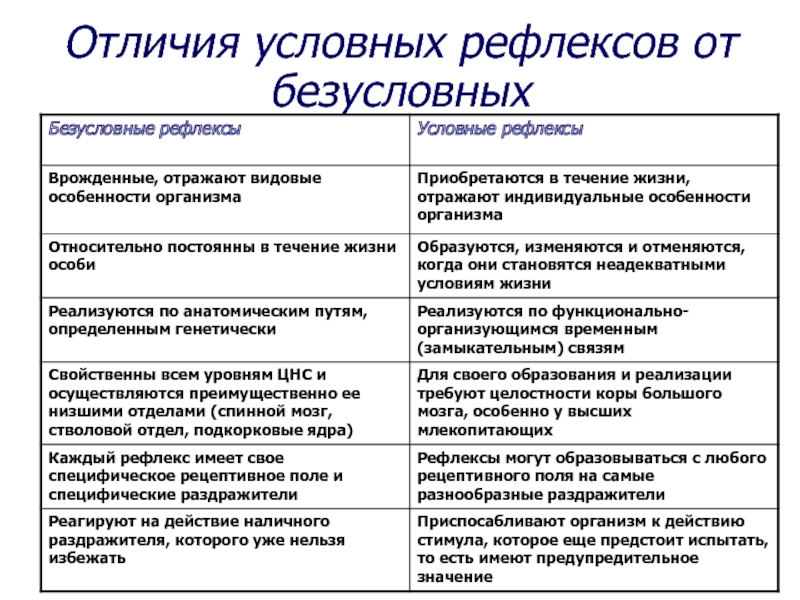 1) Приобретаемость условных рефлексов (врожденность безусловных