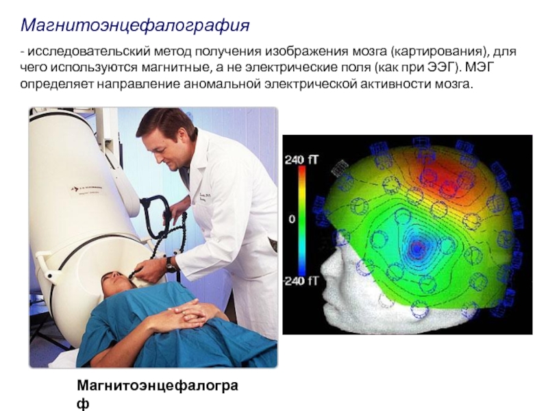 магнитные, а не электрические поля (как при ЭЭГ). МЭГ определяет направление аномальной электрической активности мозга.
