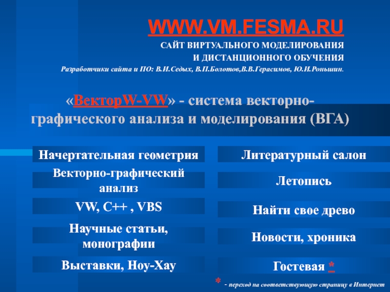 Разработчики сайта и ПО: В.И.Седых, В.П.Болотов,В.В.Герасимов, Ю.И.Роньшин.