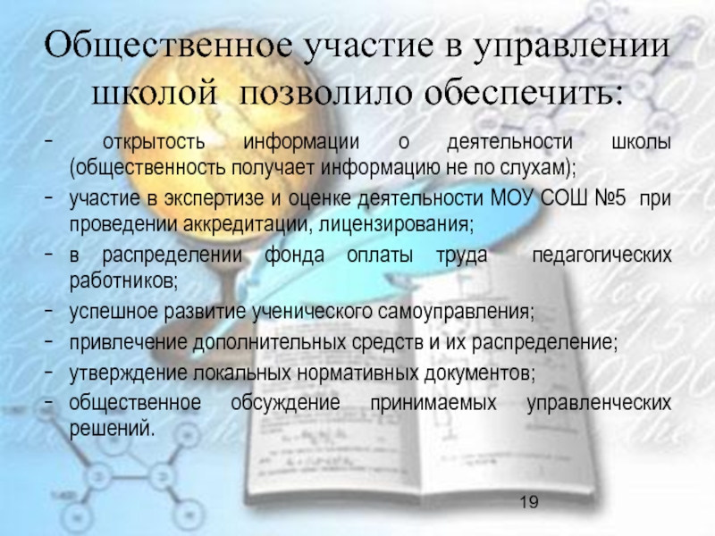 Слайд 19Общественное участие в управлении школой позволило обеспечить: