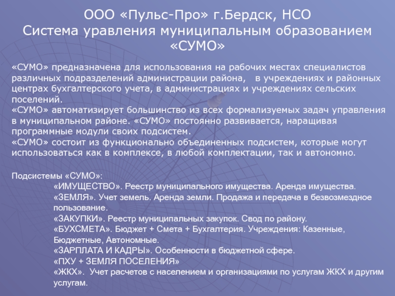 «СУМО» автоматизирует большинство из всех формализуемых задач управления в муниципальном районе. «СУМО» постоянно развивается, наращивая программные модули своих подсистем.