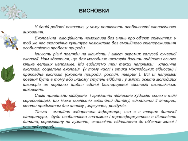 Тільки емоційно забарвлена інформація, яка є в творах дитячої літератури, буде особистісно значимою і трансформується в діяльність дитини, спрямовану на гуманне, екологічне відношення до об'єктів живої і неживої природи.