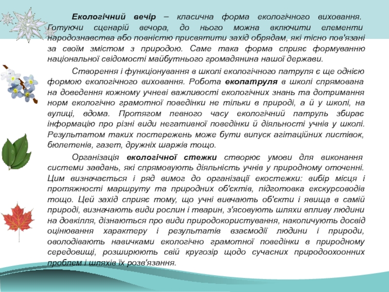 Слайд 14 Екологічний вечір – класична форма екологічного виховання. Готуючи сценарій вечора, до