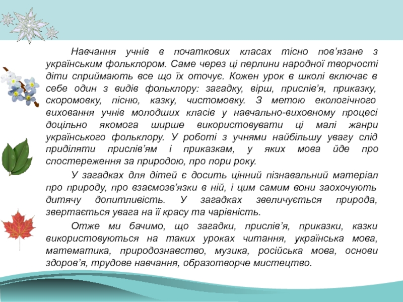 через ці перлини народної творчості діти сприймають все що їх оточує. Кожен урок в школі включає в себе один з видів фольклору: загадку, вірш, прислів’я, приказку, скоромовку, пісню, казку, чистомовку. З метою екологічного виховання учнів молодших класів у навчально-виховному процесі доцільно якомога ширше використовувати ці малі жанри українського фольклору. У роботі з учнями найбільшу увагу слід приділяти прислів’ям і приказкам, у яких мова йде про спостереження за природою, про пори року.