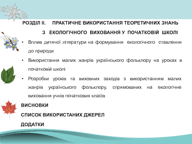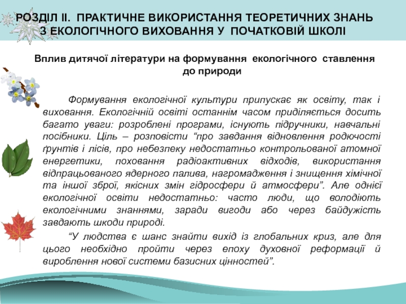 Слайд 16РОЗДІЛ II. ПРАКТИЧНЕ ВИКОРИСТАННЯ ТЕОРЕТИЧНИХ ЗНАНЬ З ЕКОЛОГІЧНОГО ВИХОВАННЯ У ПОЧАТКОВІЙ