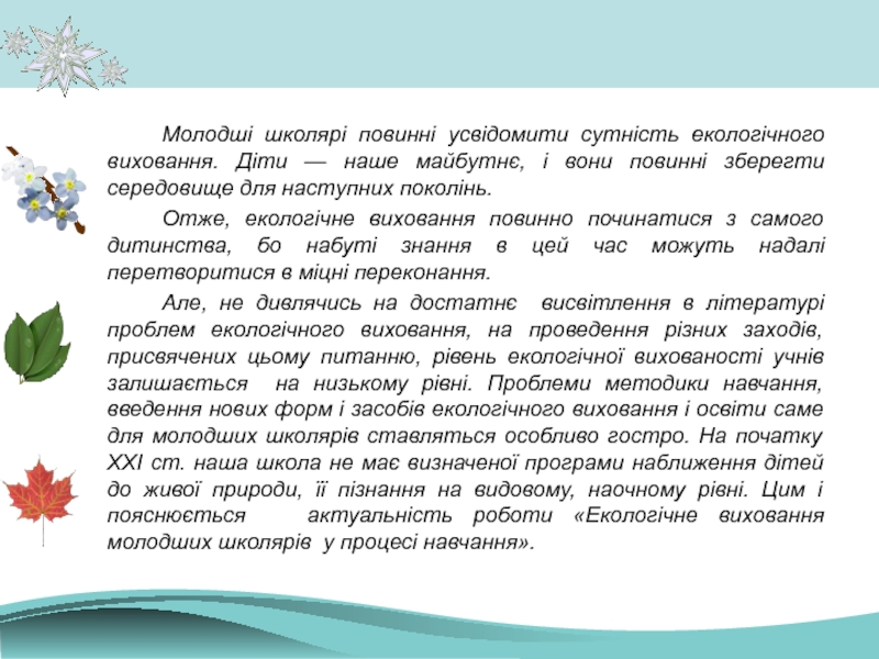 Але, не дивлячись на достатнє висвітлення в літературі проблем екологічного виховання, на проведення різних заходів, присвячених цьому питанню, рівень екологічної вихованості учнів залишається на низькому рівні. Проблеми методики навчання, введення нових форм і засобів екологічного виховання і освіти саме для молодших школярів ставляться особливо гостро. На початку ХХІ ст. наша школа не має визначеної програми наближення дітей до живої природи, її пізнання на видовому, наочному рівні. Цим і пояснюється актуальність роботи «Екологічне виховання молодших школярів у процесі навчання».