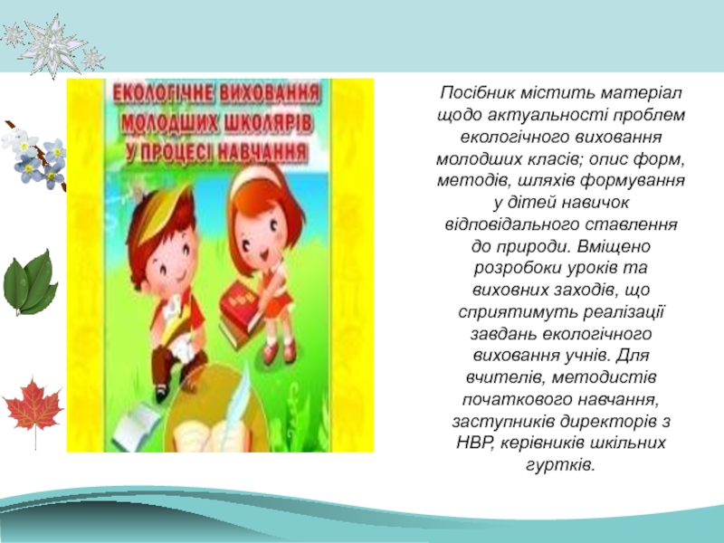 Слайд 2Посібник містить матеріал щодо актуальності проблем екологічного виховання молодших класів; опис