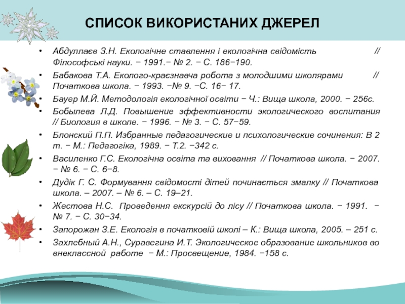 Бабакова Т.А. Еколого-краєзнавча робота з молодшими школярами // Початкова школа. − 1993. −№ 9. −С. 16− 17.
