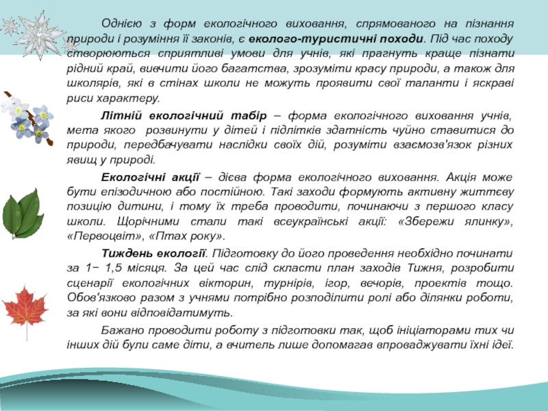 Екологічна поведінка формується з роками і не стільки на уроці, скільки в позакласній і позашкільній діяльності.