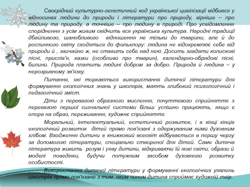 і літератури про природу, вірніше – про людину та природу, а точніше – про людину в природі. Про усвідомлення споріднення з усім живим свідчить вся українська культура. Народні традиції дбайливого, шанобливого відношення не тільки до тварини, але й до рослинного світу сходяться до фольклору: людина не відокремлює себе від природи й , звичайно ж, не ставить себе над нею. Досить згадати колискові пісні, прислів'я, казки (особливо про тварин), календарно-обрядові пісні, билини. Природа платить людині добром за добро. Природа й людина – у нерозривному зв'язку.