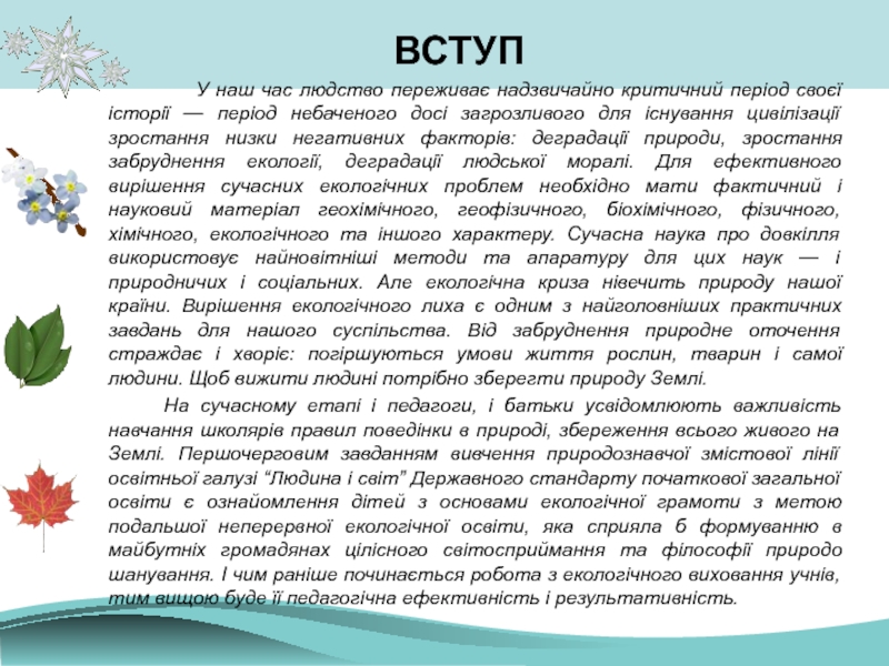 На сучасному етапі і педагоги, і батьки усвідомлюють важливість навчання школярів правил поведінки в природі, збереження всього живого на Землі. Першочерговим завданням вивчення природознавчої змістової лінії освітньої галузі “Людина і світ” Державного стандарту початкової загальної освіти є ознайомлення дітей з основами екологічної грамоти з метою подальшої неперервної екологічної освіти, яка сприяла б формуванню в майбутніх громадянах цілісного світосприймання та філософії природо шанування. І чим раніше починається робота з екологічного виховання учнів, тим вищою буде її педагогічна ефективність і результативність.