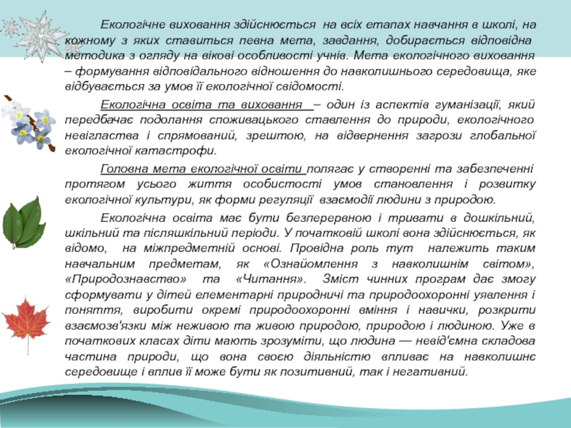 Екологічна освіта та виховання – один із аспектів гуманізації, який передбачає подолання споживацького ставлення до природи, екологічного невігластва і спрямований, зрештою, на відвернення загрози глобальної екологічної катастрофи.