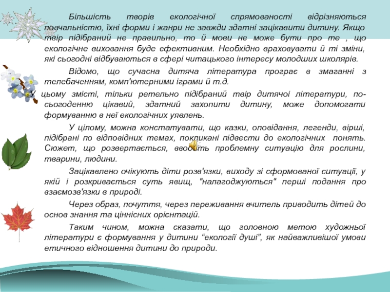 У цьому змісті, тільки ретельно підібраний твiр дитячоi лiтератури, по-сьогоденню цікавий, здатний захопити дитину, може допомогати формуванню в неї екологічних уявлень.