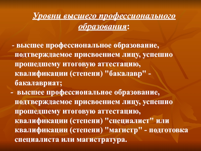 Слайд 4 - высшее профессиональное образование, подтверждаемое присвоением лицу, успешно прошедшему итоговую