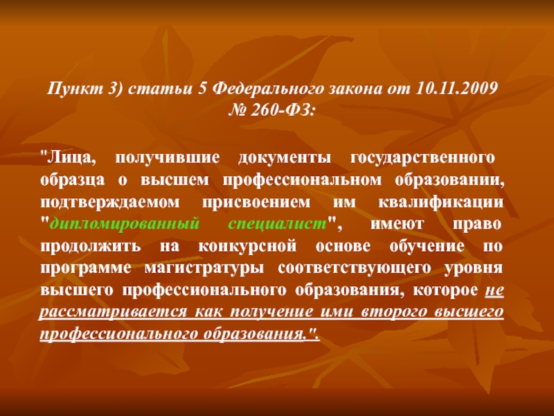Слайд 11Пункт 3) статьи 5 Федерального закона от 10.11.2009 № 260-ФЗ:
