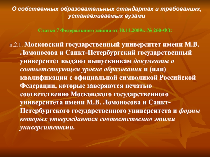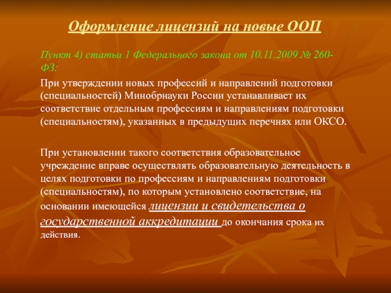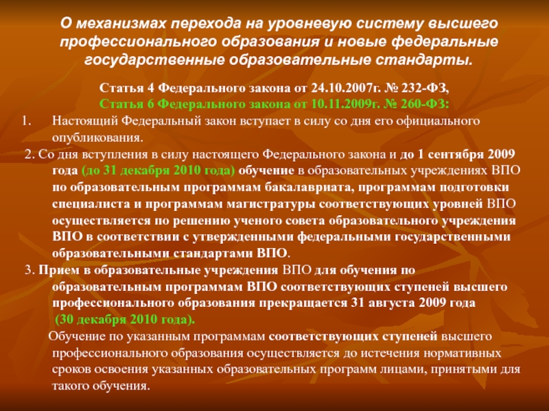 Слайд 2ПЕРЕЧЕНЬ ФЕДЕРАЛЬНЫХ ЗАКОНОВ, ОБЕСПЕЧИВАЮЩИХ ПЕРЕХОД НА УРОВНЕВУЮ СИСТЕМУ ВПО и НОВЫЕ