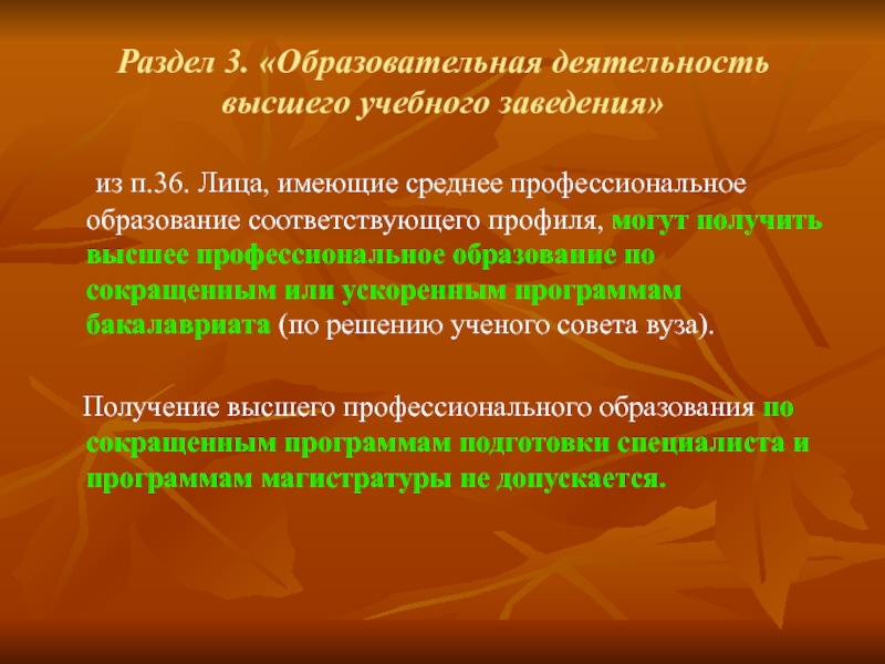 Получение высшего профессионального образования по сокращенным программам подготовки специалиста и программам магистратуры не допускается.