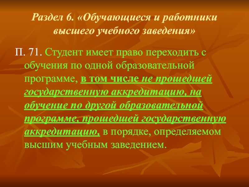 Слайд 41П. 71. Студент имеет право переходить с обучения по одной образовательной