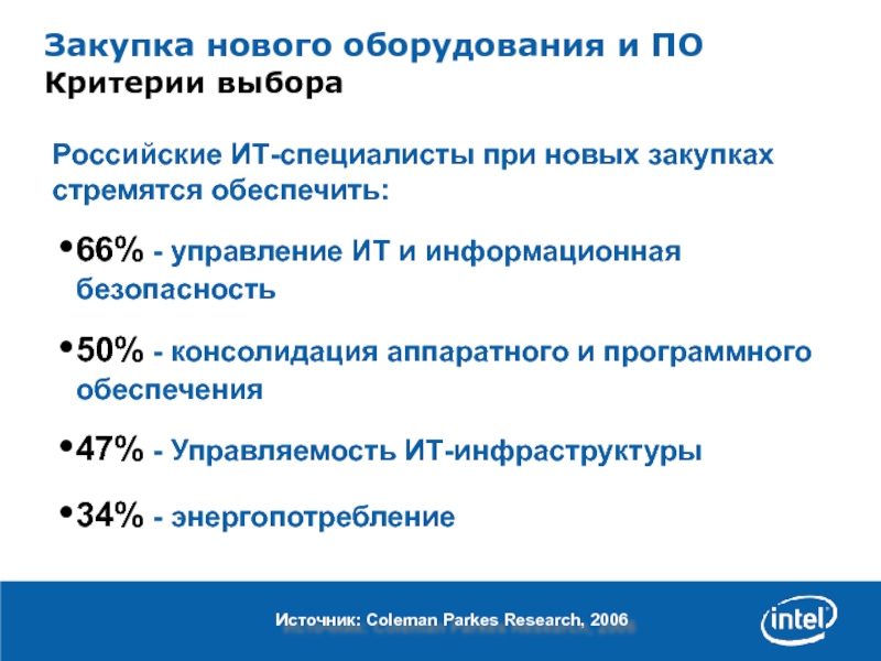 Слайд 7Закупка нового оборудования и ПО Критерии выбора