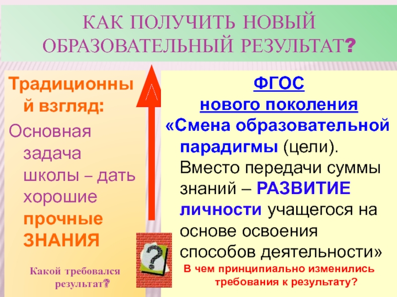 «Смена образовательной парадигмы (цели). Вместо передачи суммы знаний – РАЗВИТИЕ личности учащегося на основе освоения способов деятельности»