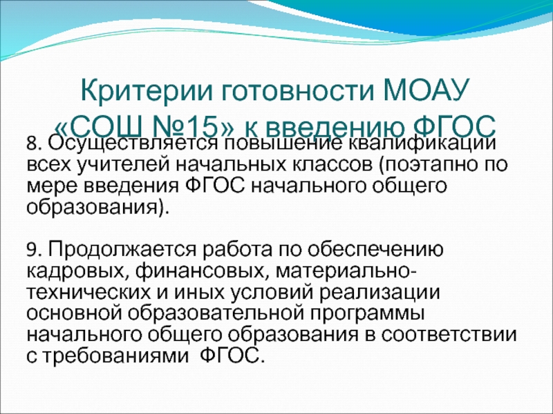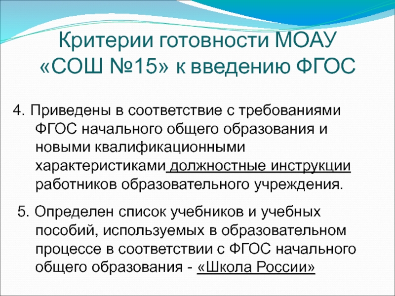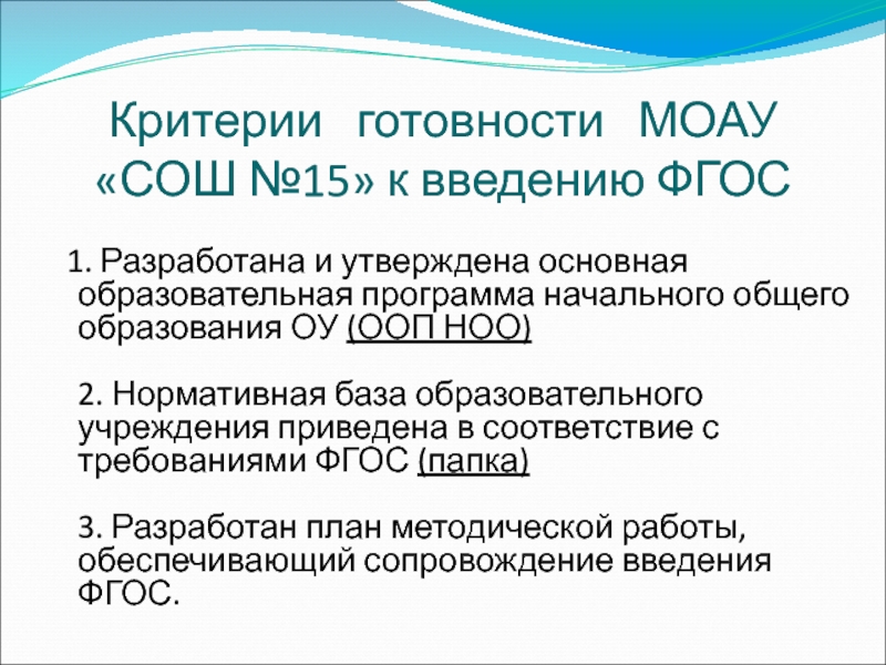 Критерии готовности МОАУ «СОШ №15» к введению ФГОС