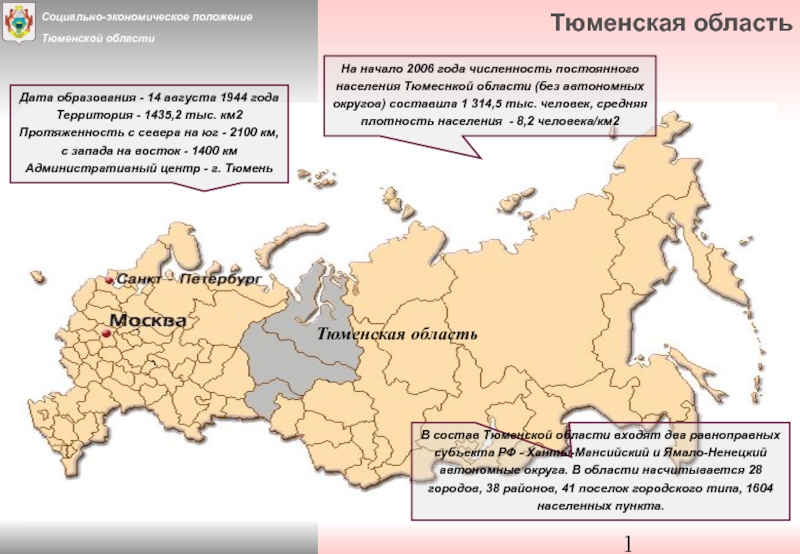 На начало 2006 года численность постоянного населения Тюмеснкой области (без автономных округов) составила 1 314,5 тыс. человек, средняя плотность населения - 8,2 человека/км2