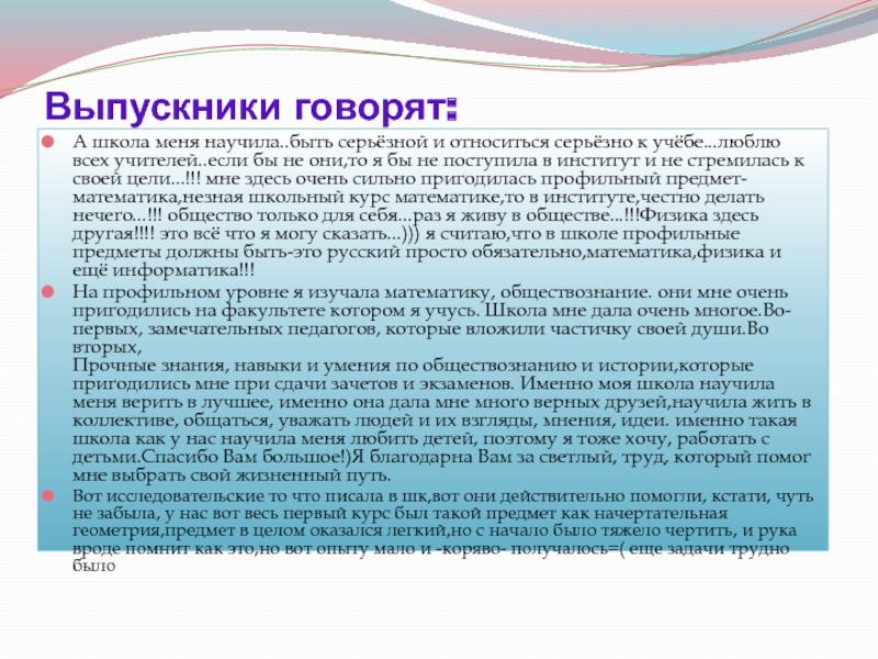 Прочные знания, навыки и умения по обществознанию и истории,которые пригодились мне при сдачи зачетов и экзаменов. Именно моя школа научила меня верить в лучшее, именно она дала мне много верных друзей,научила жить в коллективе, общаться, уважать людей и их взгляды, мнения, идеи. именно такая школа как у нас научила меня любить детей, поэтому я тоже хочу, работать с детьми.Спасибо Вам большое!)Я благодарна Вам за светлый, труд, который помог мне выбрать свой жизненный путь.