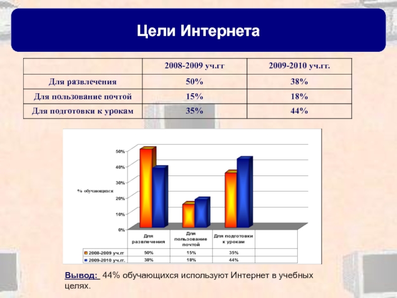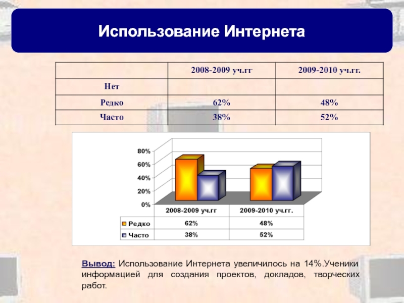 Вывод: Использование Интернета увеличилось на 14%.Ученики информацией для создания проектов,