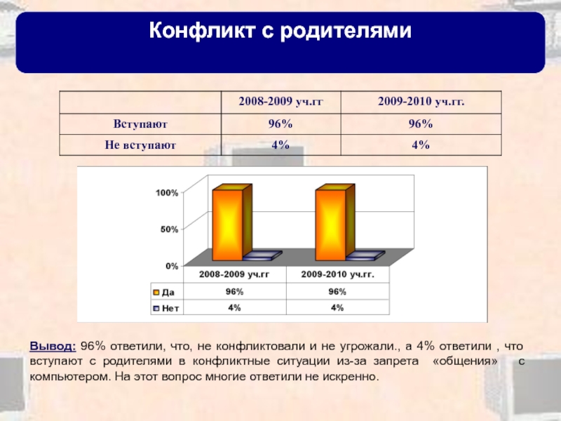 а 4% ответили , что вступают с родителями в конфликтные ситуации из-за запрета «общения» с компьютером. На этот вопрос многие ответили не искренно.